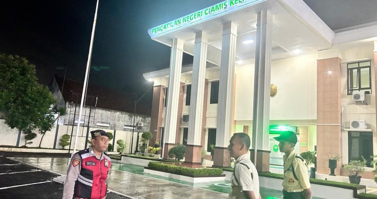 CIAMIS ~ Personel Satuan Samapta Polres Ciamis Polda Jabar melaksanakan patroli kamtibmas ke kawasan objek vital seperti perkantoran di Kabupaten Ciamis. Kegiatan ini sekaligus untuk berkoordinasi dan pembinaan ke satuan keamanan (Satpam) perkantoran. Seperti ini dilakukan ke Anggota Satpam Kantor Pengadilan Negeri Ciamis, Kecamatan Ciamis, Kabupaten Ciamis, Jawa Barat, Jumat, 23 Januari 2026, malam.