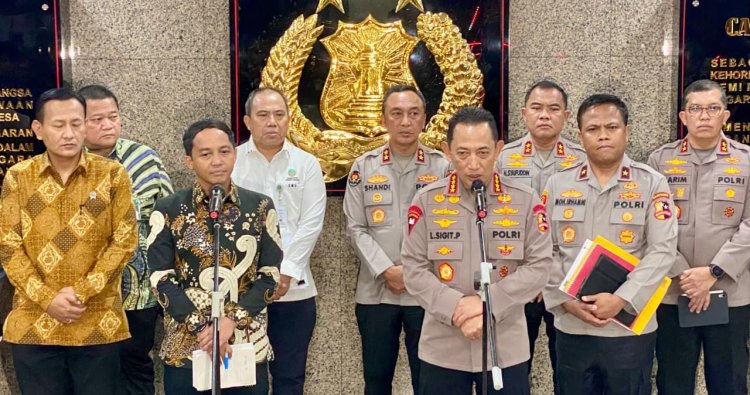 Jakarta - Kapolri Jenderal Polisi Listyo Sigit Prabowo bersama Menteri Kehutanan Raja Juli Antoni menggelar doorstop usai audiensi di Gedung Utama Mabes Polri, Kamis malam (4/12/2025). Pertemuan tersebut membahas penanganan temuan kayu yang diduga menjadi salah satu faktor terjadinya kerusakan infrastruktur dan korban jiwa akibat bencana di Aceh, Sumatera, dan Sumatera Barat.