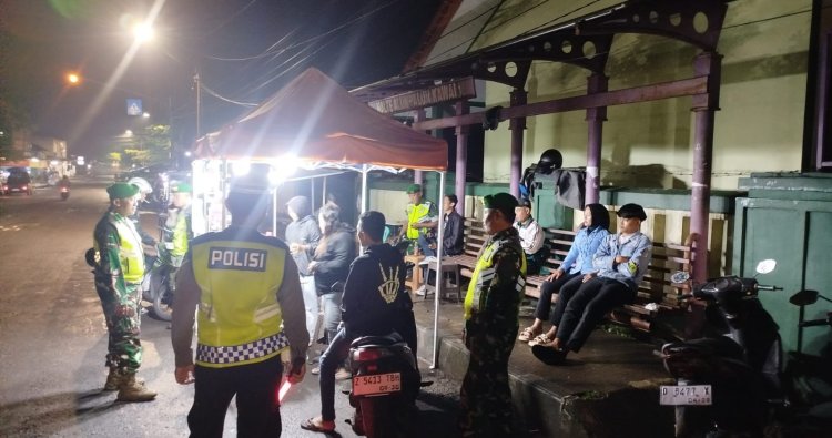 CIAMIS ~ Personel Pos Pengamanan Kawali Polres Ciamis Polda Jabar Operasi Lilin Lodaya 2025 melaksanakan patroli jalan kaki sinergitas TNI-Polri ke tempat keramaian warga saat momen Libur Panjang Anak Sekolah, Natal dan Tahun Baru 2025 di malam hari. Patroli jalan kaki ini dilaksanakan di sekitar area Pos Pengamanan Kawali, Taman Surawisesa, Kawali, Kabupaten Ciamis, Jawa Barat, Rabu, 24 Desember 2025, malam.