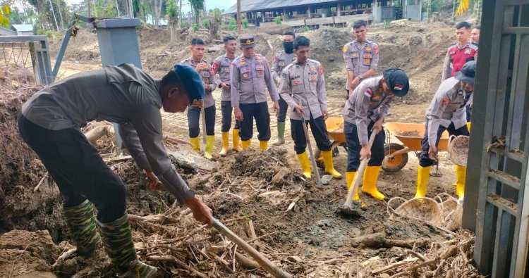 Dengan penuh semangat, personel Polri bersama warga bahu-membahu membersihkan lumpur yang mengendap di dalam ruangan pelayanan, kamar pemeriksaan, garasi, hingga area lingkungan sekitar Polindes.