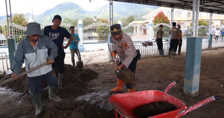 Tanpa mengenal lelah, personel Polri, Brimob, dan warga bergotong royong menyapu lumpur, mengangkat sisa material banjir dan longsor, serta menata kembali halaman dan area masjid. Kebersamaan tersebut menjadi potret nyata solidaritas dan kepedulian di tengah duka pascabencana.