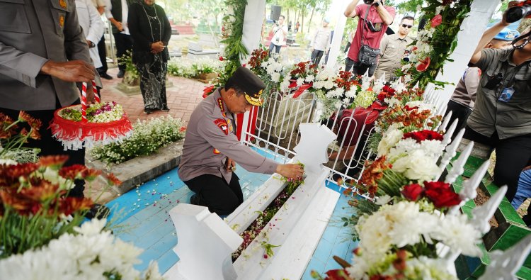 Jatim - Kapolri Jenderal Listyo Sigit Prabowo berziarah ke makam Pahlawan Nasional Marsinah di Kecamatan Sukamoro, Kabupaten Nganjuk, Jawa Timur (Jatim). Ia juga melihat rumah masa kecil dari tokoh buruh tersebut.